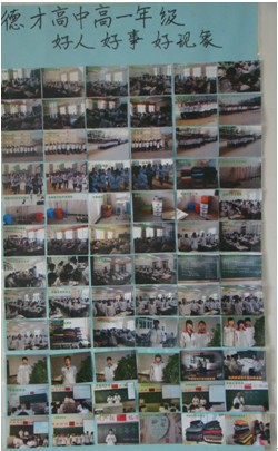 教育是一份需要用心做的事业,不是有了老师,有了课堂就足够了。校园是人们理想中最美好的育人场所,所以校园环境的设计应该是最有文化内涵的。德才的校园注重用文字的力量来唤醒学生的心灵,同时在走廊内还有一处别出心裁的设计,经常引来学生和教师的驻足围观。那就是每个年级的“好人好事好现象风采展”。每个年级的教导处配有一个照相机,随时用它拍下本年级各班学生的好人好事好现象。然后及时展出,以示表扬和鼓励,同时起到宣扬和教化的作用。这就是德才用心的地方。